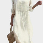 Vybavte svůj šatník tímto šatem pro každodenní nošení v teplých dnech, na plážové procházky a volnočasové vycházky. Lněná tkanina zajišťuje prodyšnost a přírodní chlazení, přesto jedinečný střih zůstává pohodlný po celý den.