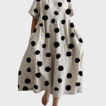 Nadčasový lesk – šaty s puntíky, které spojují klasickou eleganci s hravým duchem. Model s černými puntíky na bílém podkladu vytváří výrazný, ale zároveň jemný vzor, ​​který se hodí pro každou příležitost. Klasický střih a pohodlná, vzdušná linie zajišťující komfort a volnost pohybu po celý den.