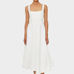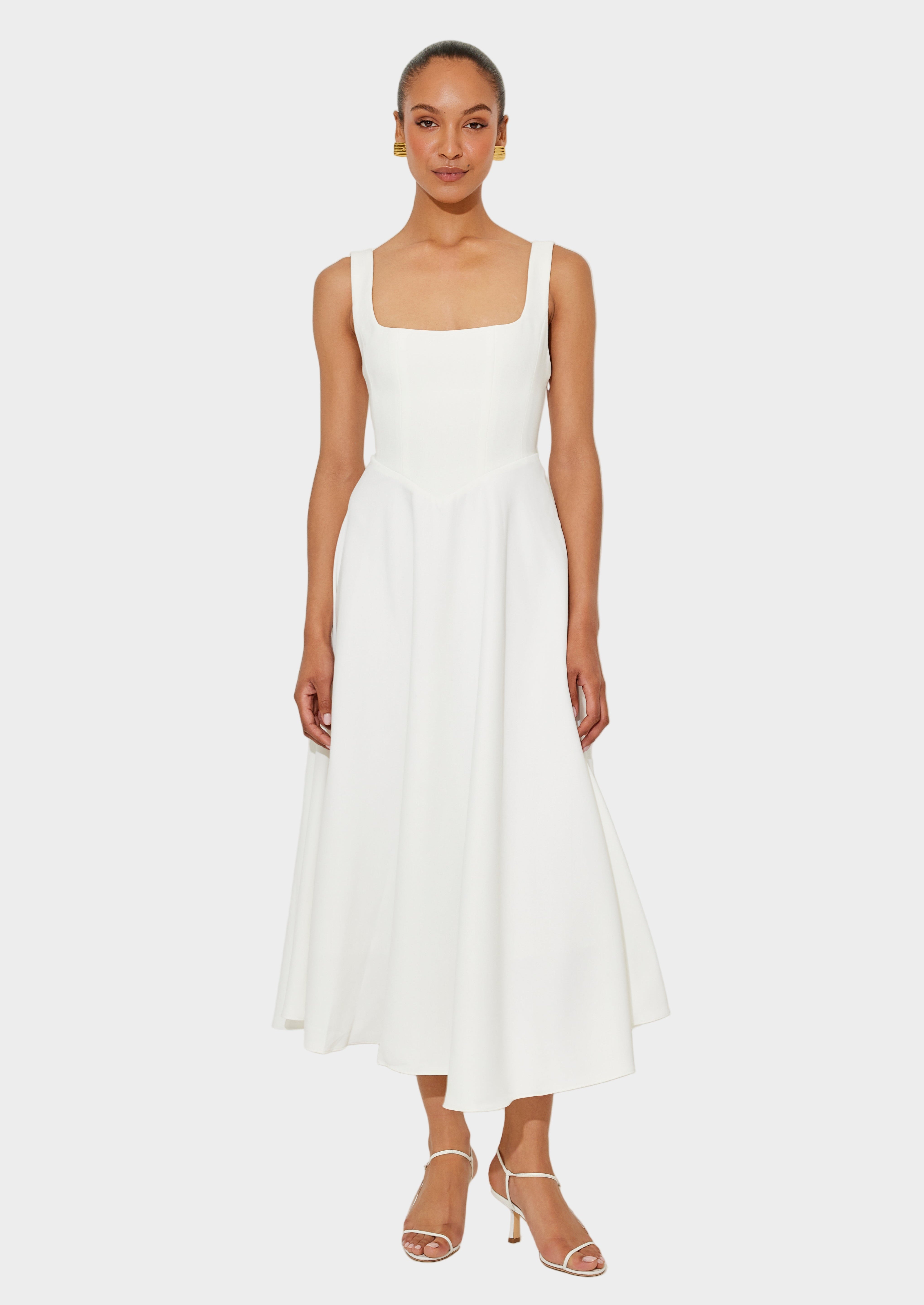 Nadčasové bílé midi šaty s lehkým, vzdušným pohybem a čistým minimalistickým střihem vám zajistí jemnou eleganci pro každou výjimečnou. Precizní střih a pohodlné provedení pohybu vytváří dokonalé spojení elegance a přirozeného, ​​které oceníte během formálních i semiformálních událostí.