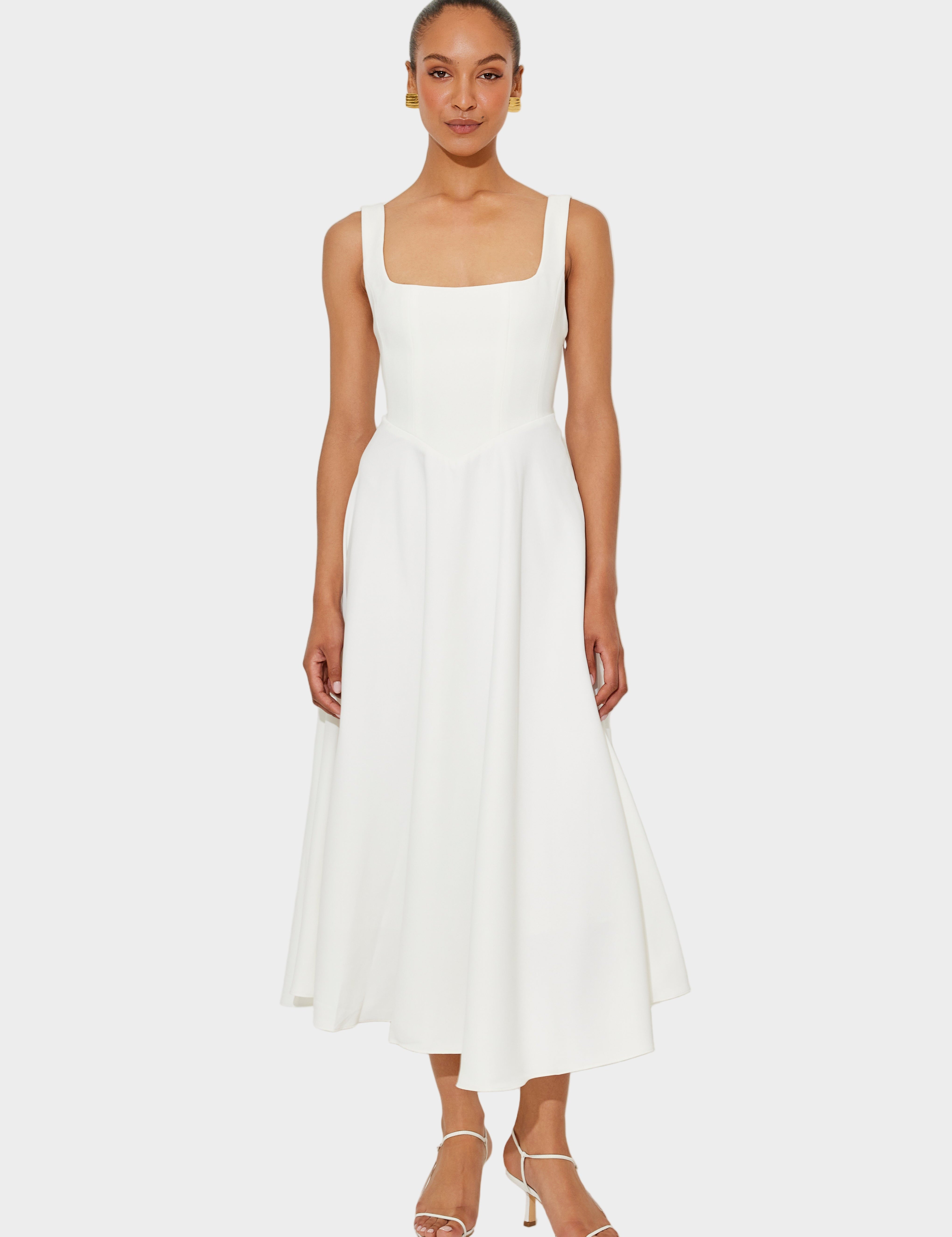 Nadčasové Bílé Midi Šaty S Lehkým Pohybem A Čistým Střihem