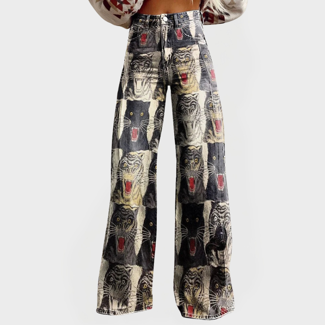 Objevte stylové a pohodlné džíny s širokými nohavicemi, inspirované odvážným street stylem. Tento kousek se vyznačuje překvapivým potiskem: postupně se opakující motivy tváří divokých koček, které dodají vašemu outfitu úpravu a odvahu.