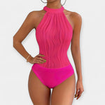 Ruchingový detail jemně zakrývá nedokonalosti a zvýrazňuje pas, čímž vytváří štíhlejší siluetu. Elastický materiál obepíná tělo a zajišťuje pohodlí při pohybu ve vodě i na břehu.