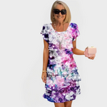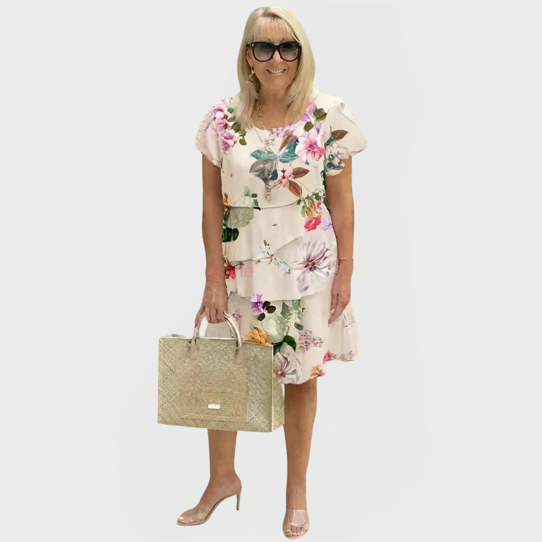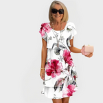 Objevte svou ženskost v těchto krásných letních šatech, které spojují romantiku v pohodlí. Bílá základna zdobí výrazné květy v šedých a šedých tónech, zatímco lichotivý střih s jemnými volány ve vrstvách dodává šatům něžný vzhled. Lehký, prodyšný materiál zajišťuje pohodlné nošení v horkých dnech. Ideální volba na procházky, dovolená nebo letní akce.