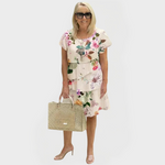 • Letní šaty s květinovým vzorem — bílý podklad s výraznými květy v růžových a šedých tónech pro svěží, romantický vzhled.
