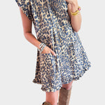 Obohaťte svůj šatník o stylové mini šaty s leopardím potiskem, které spojují hravost s elegancí. Přirozeně lichotivý střih a lehký materiál z nichž dělají skvělou volbu pro každodenní nošení s nádechem sofistikovanosti. Volán na konci dodává pohyblivou, ženskou estetičnost a praktické kapsy na přední straně zajišťující komfort při každodenním nošení.