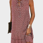 Objevte šarm s Mini šaty s výrazným letním vzorem a detailem zavazování u výstřihu. Tento krátký střih s výrazným motivem nabízí lehkou a vzdušnou volbu pro horké dny, ideální pro každodenní nošení i neformální výlety.
