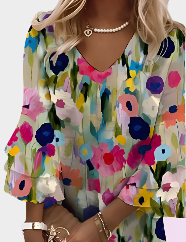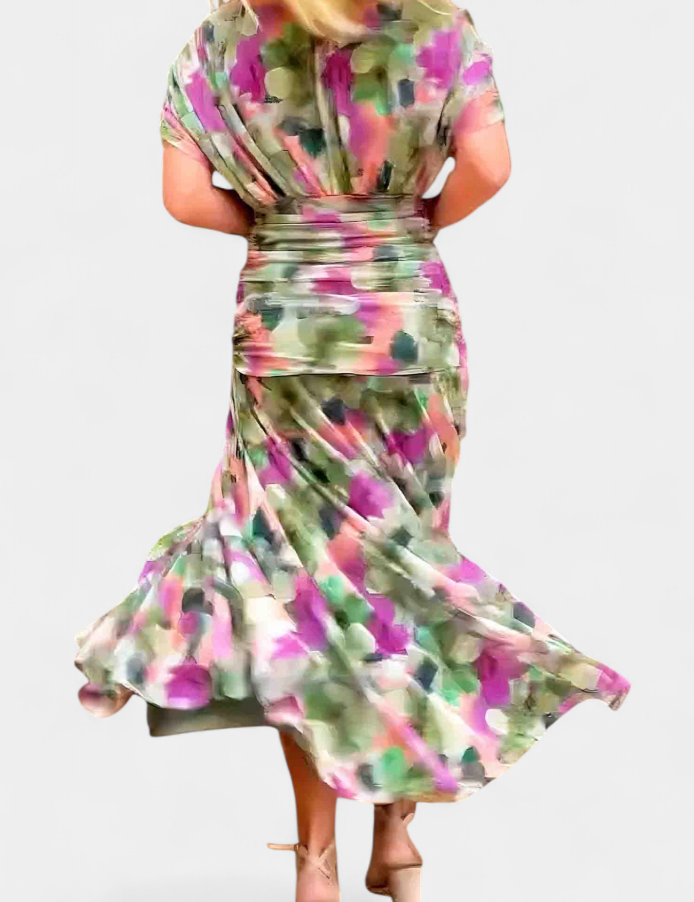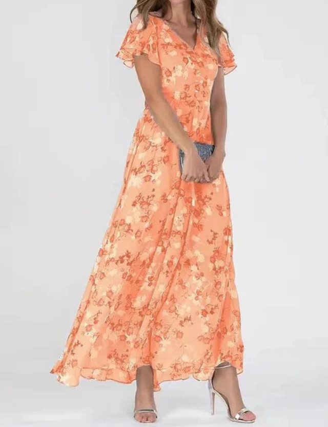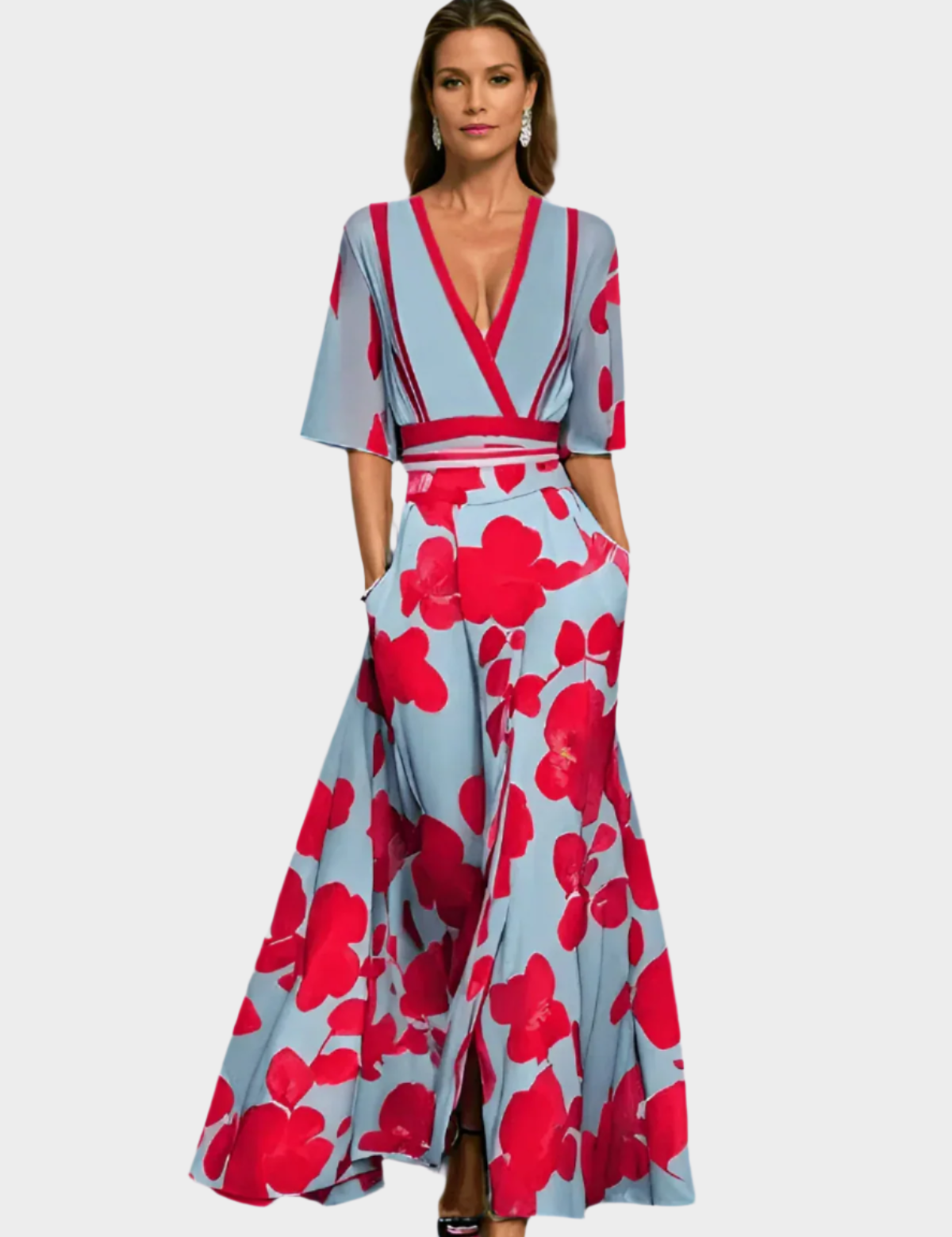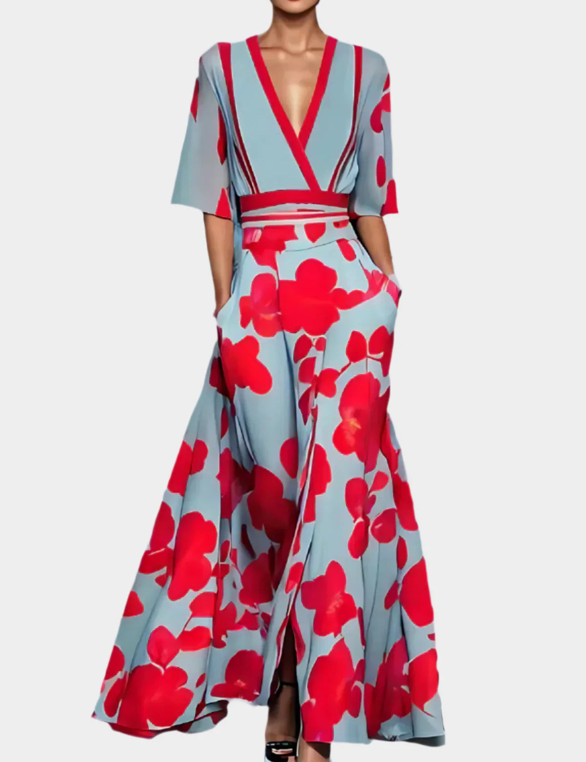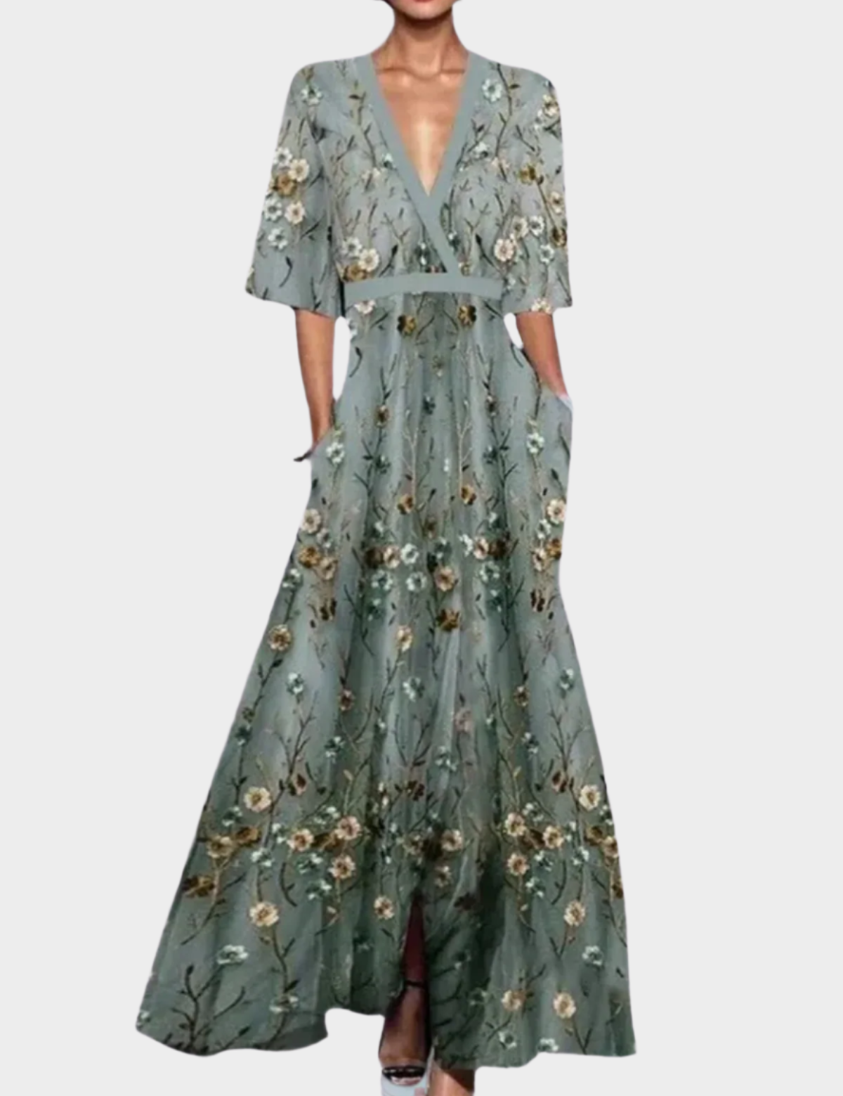 Dlouhé Šaty s Květinovým Vzorem a Výstřihem do V na Večery