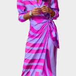 Vytisknuté šaty s nastavitelným pasem se vyznačují živým geometrickým potiskem v oranžové a růžové, který okamžitě upoutá pozornost. Díky zavinovacímu střihu s nastavitelným páskem jemně zvýrazňují pas a dodávají šatům elegantní charakter.