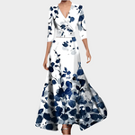 Podtrhněte svou dynamickou ženskost s tímto dlouhým šatem s květinovým vzorem a výstřihem do V. Kombinace výrazného barevného kontrastu červeného a modrého a lesklého designu vytváří glam chic look, který se hodí pro večerní události i speciální příležitosti.