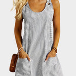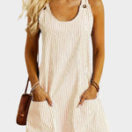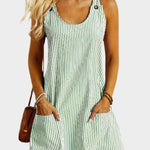 Letní pruhované šaty bez rukávů s tenkými ramínky a kapsami jsou ideální volbou pro horké dny. Krátký střih, příjemné pohodlí a vždy stylové provedení – perfektní do města, na dovolenou i na pohodlný brunch.