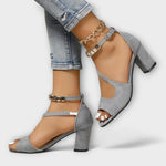 Objevte letní eleganci s našimi stylovými sandály na širokém podpatku. Tento design spojuje pohodlí, styl a sebevědomí pro každý den i zvláštní příležitosti. Elegantní šedá barva se hodí k téměř každému outfitu a snadno se kombinuje se svými kousky. Robustní, masivní podpatek poskytuje stabilitu a komfort při každém kroku. Otevřená špička a elegantní střih zvýraznění nohou a dodají lehkost vašeho vzhledu. Nastavitelný pás na kotník obklopí nohu a dodá extra styl a jistotu při chůzi.