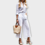 Objevte elegantní soupravu kalhot a košile, která spojuje nadčasovou eleganci s pohodlím pro každodenní nošení i zvláštní chvíle. Jeho uvolněný střih a minimalistická estetika zajišťuje, že tento set je skvělou volbou pro všechny příležitosti – od běžných vycházek po mimořádné události. Praktický a současný design poskytuje svobodu pohybu a jemný dotek, který dodá vašemu outfitu nenucenou, ale zároveň výraznou živelnost.