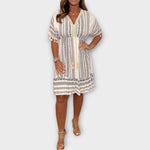 Krátké šaty s volným střihem a diskrétními detaily spojující pohodlí s jemnou elegancí – ideální volba pro každodenní okamžiky i zvláštní příležitosti.