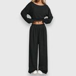 Styl a pohodlí v jednomasymetrický výstřih dodává trendy nádech, zatímco volný střih a široké kalhoty zajišťují komfort po celý den.