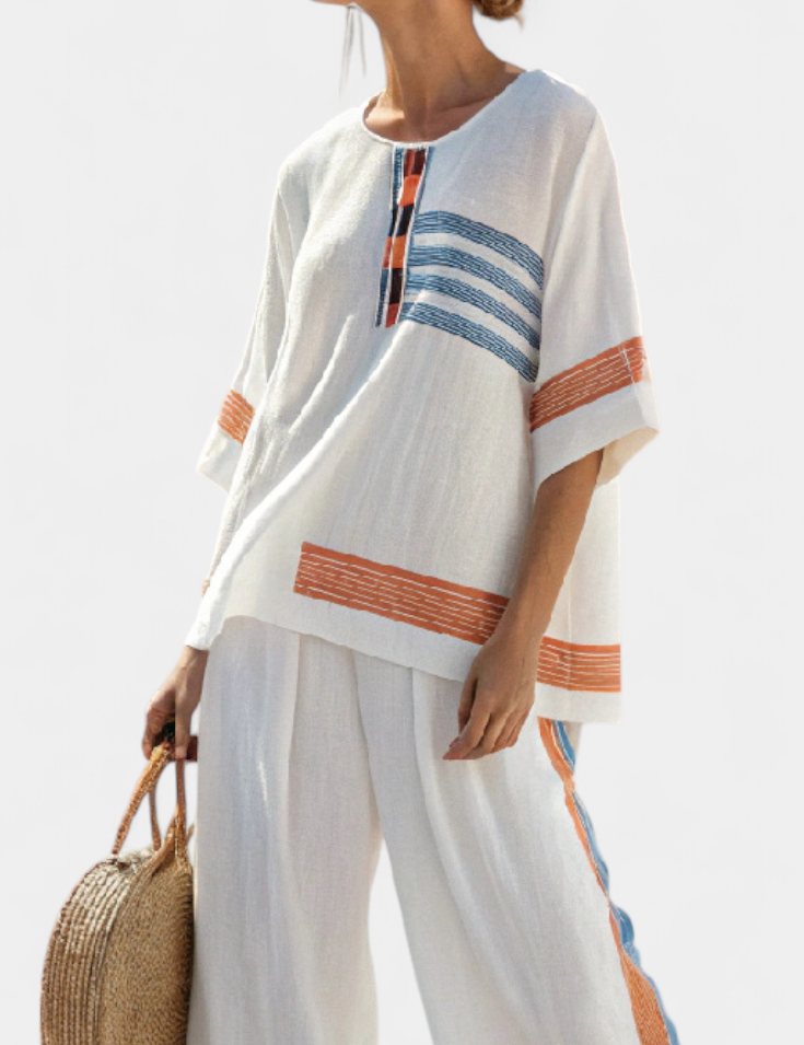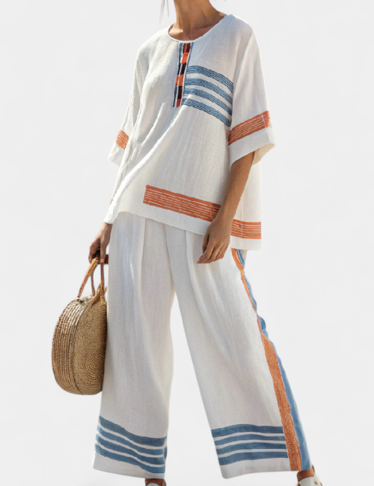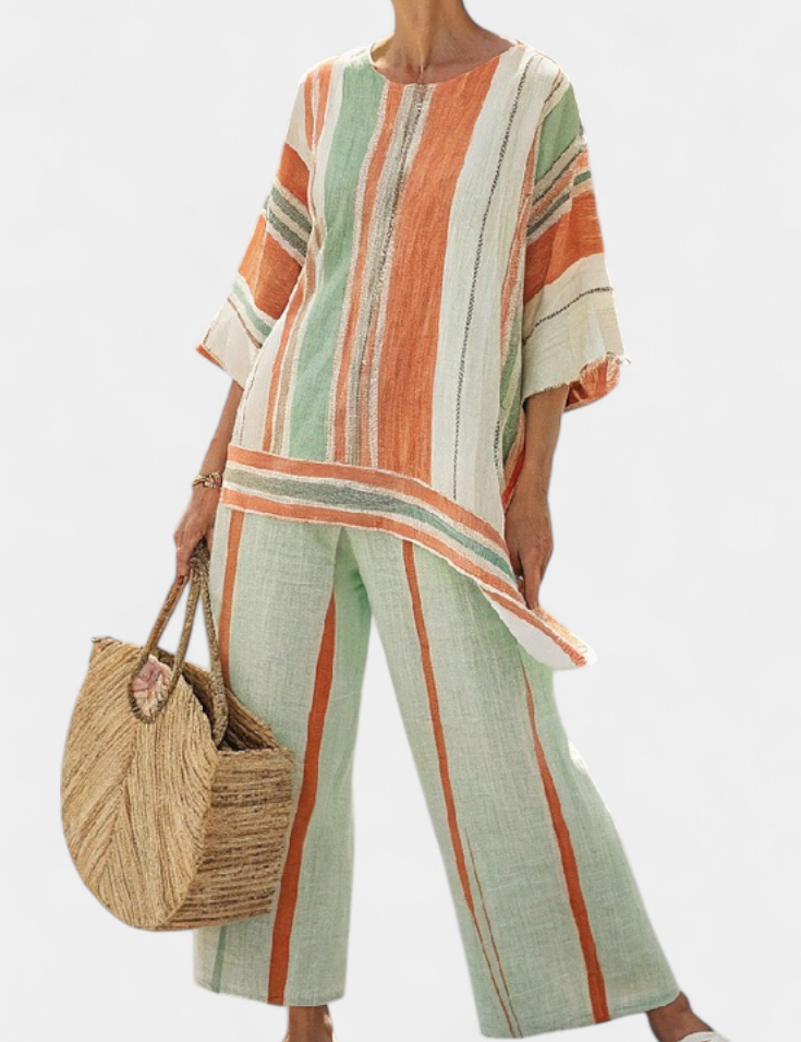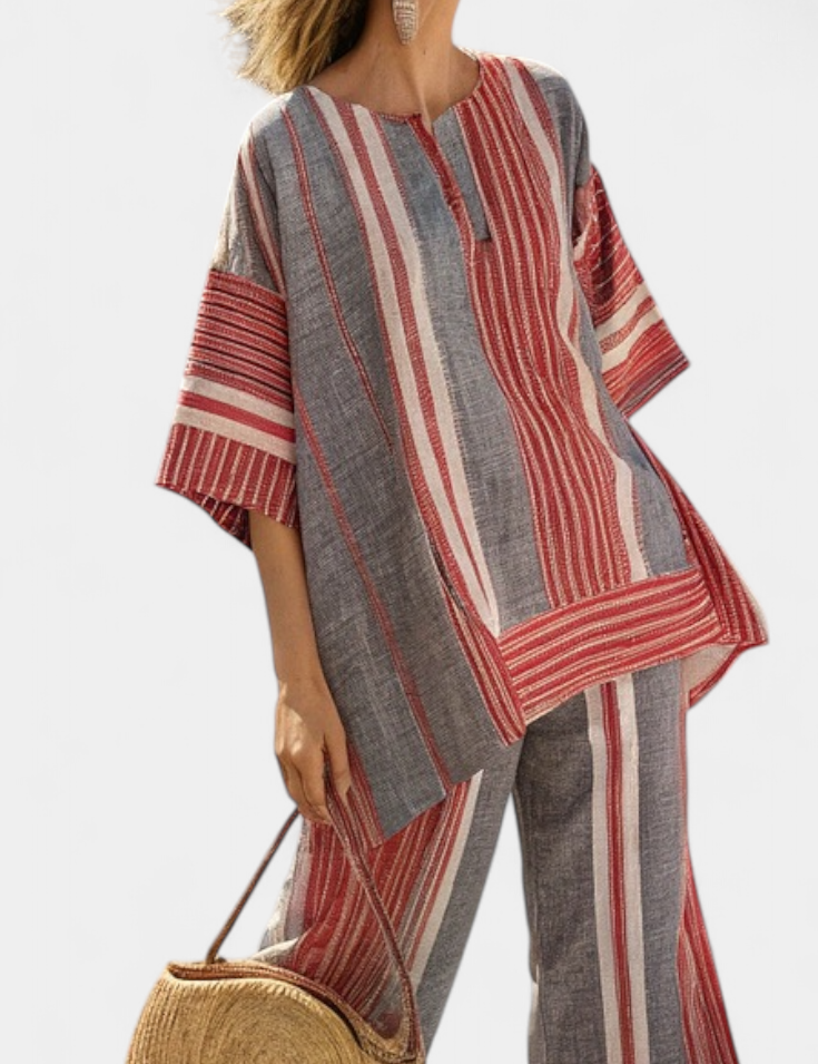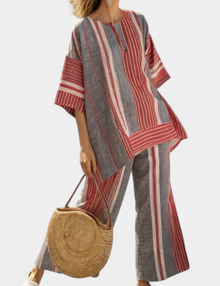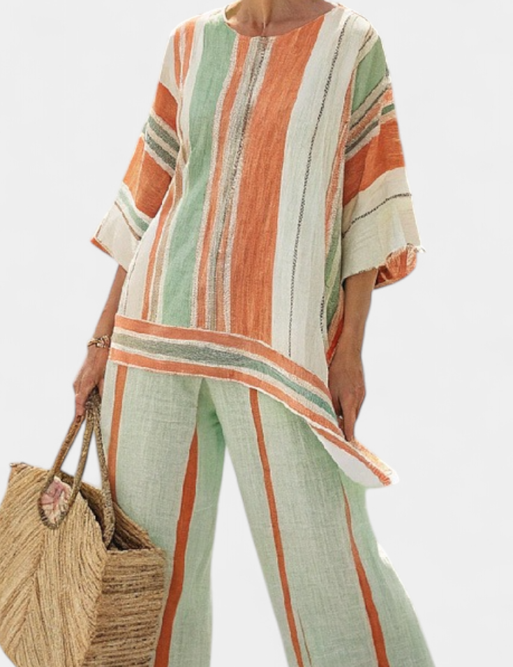 Elegantní Set Z Lněného Bambusu Pruhovou Halenkou A Kalhoty