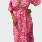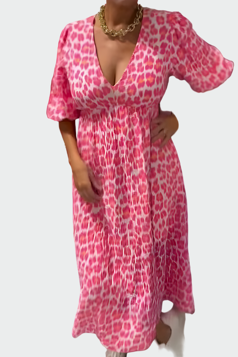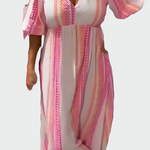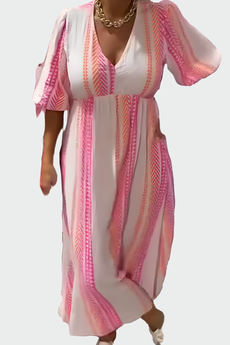 Letní vzduch maxi šaty pro ženy, které hledají lehkost a styl v jednom kousku. Tyto šaty přinášejí kombinaci romantické růžové a čisté bílé s výraznými geometrickými vzory, které okamžitě oživují každý letní outfit.