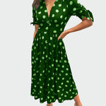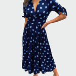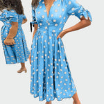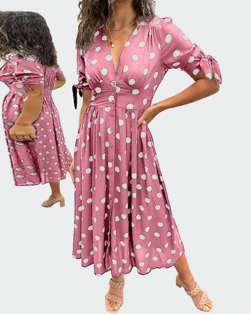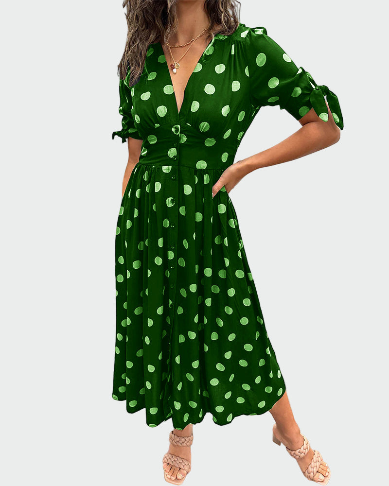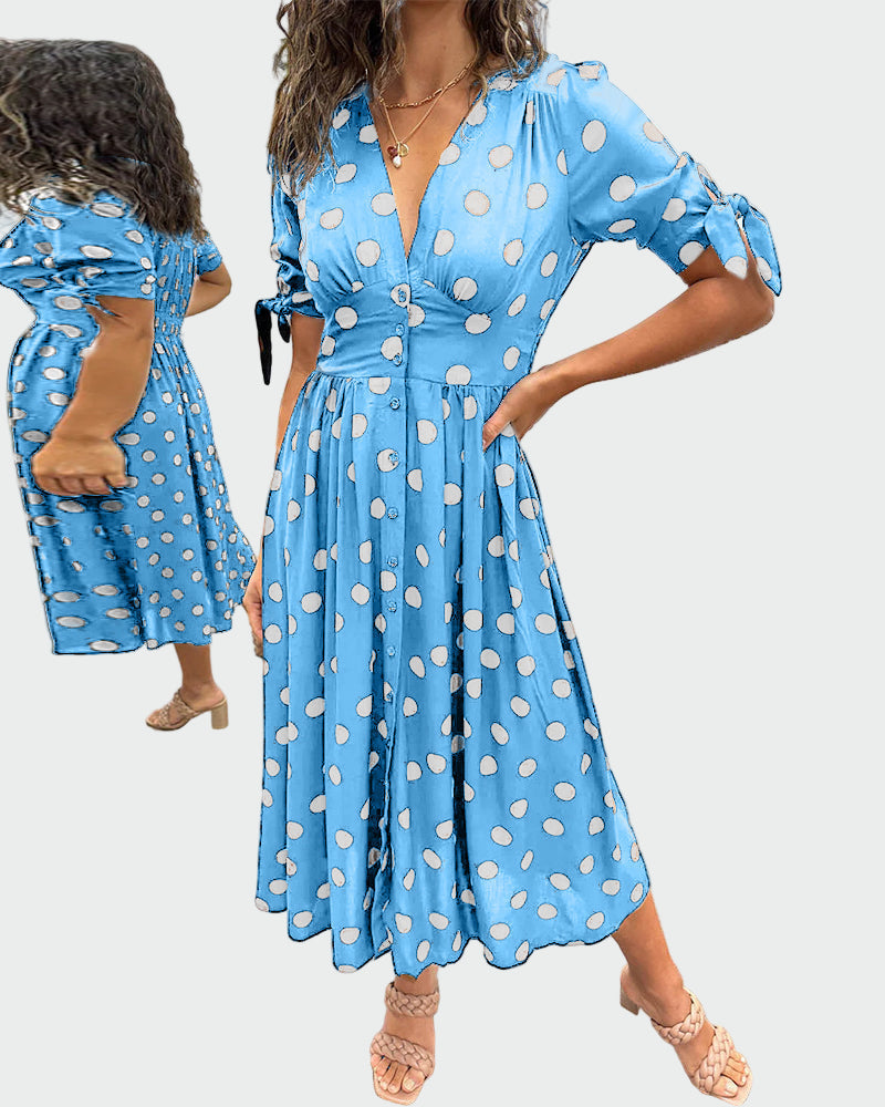 Hluboký výstřih do V a tvarovaný pas vytvoří zdůrazněnou siluetu, která lichotí ženským křivkám. Knoflíky po celé délce šatů dodávají šarm a umožňují jemnou regulaci dekoltu. Rukávy s tkaničkou pak přinášejí lehký, elegantní detail, který dokresluje romantický dojem.