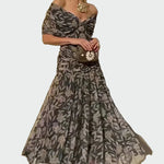 Elegantní šaty s výstřihem do V a odhalenými rameny vyzařují romantiku a jemnost. Květinový vzor a lehká, splývavá látka dodávají šatům vzdušný pohyb, který vytváří elegantní a působivý dojem při každé zvláštní příležitosti.