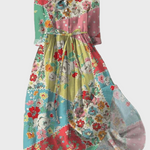 Toto působivé dlouhé šaty v patchwork stylu přináší do každého dne hravost a retro šarm. Kombinace živých barev – růžové, zelené, modré a žluté – vytváří jedinečný vzor s květinovým motivem a puntíky, který okamžitě upoutá pozornost.