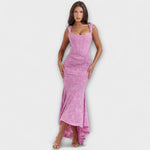 Objevte dlouhé šaty, které snoubí jemnou eleganci a romantický šarm. Model v jemném levandulovém odstínu zaujme svým šikmým korzetem a drapovaným detailem v pase, který dokonale zvýrazní siluetu a dodá šarm každé příležitosti.