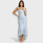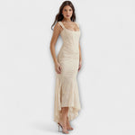 - Délka : Dlouhé šaty s lehce asymetrickým zakončením, které propůjčuje pohyb a lehkost.