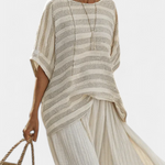 V tomto kompletu se potkává pruhovaná blůza s jemným střihem a široké kalhoty s volnými nohavicemi. Materiál z len-bambusové směsi nabízí svážest, měkkost a plynulost při každém pohybu — ideální pro slunečné dny na pláži, procházky městem či klidné dovolené.