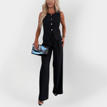 Elegantní set kalhot s tílkem bez rukávů je dokonalým spojením stylu, pohodlí a diskrétního luxusu pro ženy, které chtějí vypadat sebevědomě a elegantně v každodenních i zvláštních okamžicích. Tento komplet kombinuje tílko bez rukávů s jemnými knoflíky a kalhoty v rovné linii pro čistý, sofistikovaný vzhled, který vydrží po celý den.
