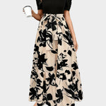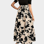 Květinové šaty s vysokým pasem spojují eleganci a moderní design. Černý top se skvěle doplňuje výraznou béžovou sukní s černými květinovými motivy, díky čemuž tento kousek zaujme na každé příležitosti a dodá vám výjimečnou prezentaci.