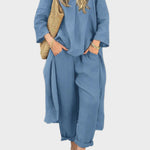 Elegantní Modrý Lněný Set pro Letní Vycházky a Volný Čas