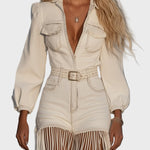 Představujeme džínsové mini šaty s třásněmi – jedinečný kousek ve stylu western, který příležitost kombinuje eleganci a odvahu pro zvláštní, na které chcete opravdu zazářit. S hlubokým dekoltem a integrovaným páskem tato minisukně čeká vaši siluetu, zatímco chvíli na konci dodávají pohyb a dynamičnost každému kroku. Barva: klasická bílá pro neodolatelnou eleganci.
