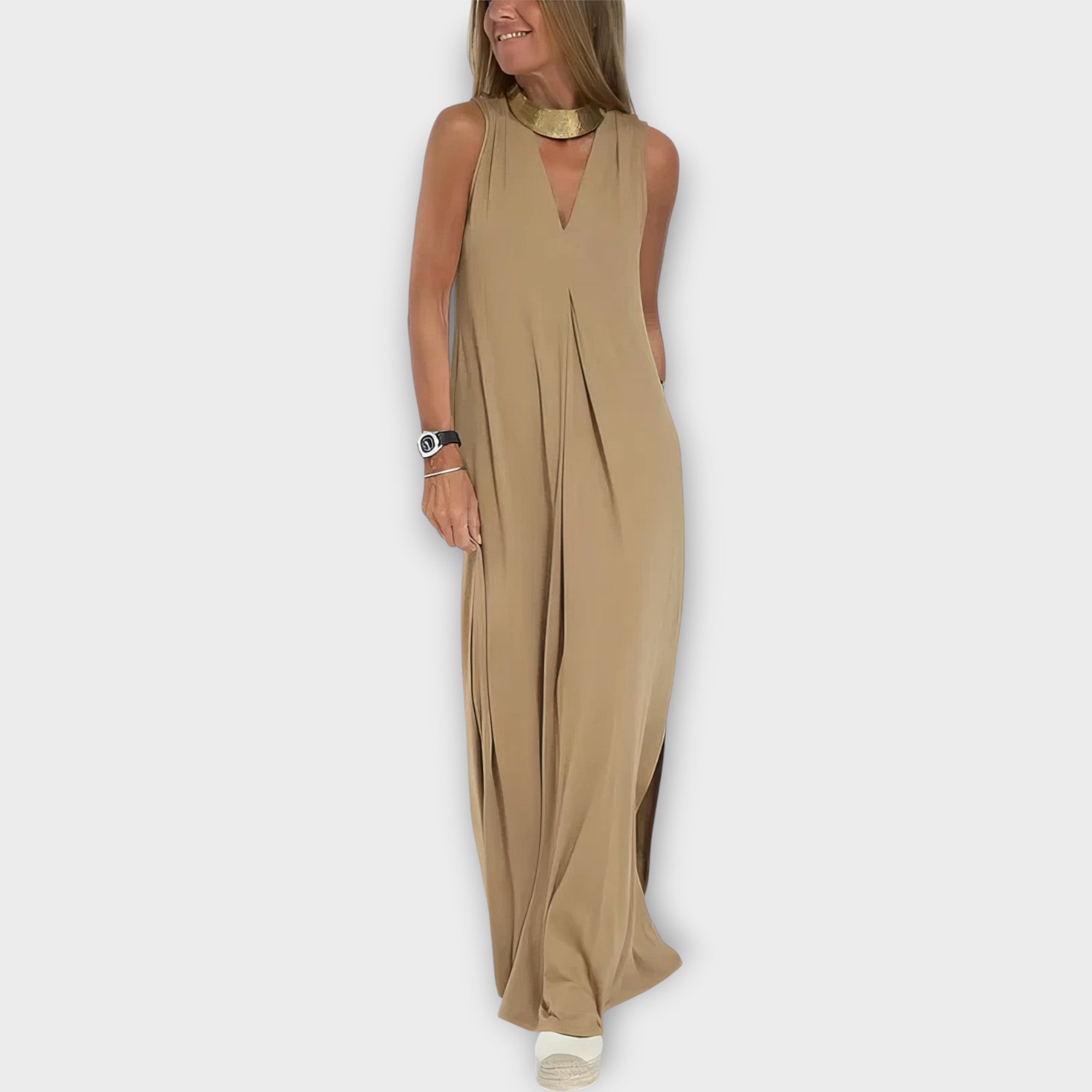 Beze rukávů maxi šaty s diskrétní elegancí představují ideální spojení praktičnosti, pohodlí a nadčasového stylu. Tento kousek se snadno přizpůsobí vašemu osobitému vzhledu a stane se spolehlivým oblíbeným pro každou příležitost.