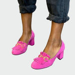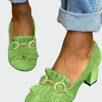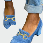 Elegantní lodičky s detailem třásní a zlatou sponou spojují klasiku s moderními detaily. Kovový ozdobný prvek na horní části dodává botám nádech luxusu, zatímco ozdobné pásky s třásněmi přinášejí retro šarm se současnou elegancí. Střední podpatek zajišťuje pohodlí a při každém kroku, takže jsou ideální pro každodenní nošení i pro sofistikované večerní looky.