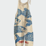 Objevte retro květinový overal s hravým mořským nádechem. Tento jedinečný kousek kombinuje výraznou uměleckou stopu s lehkostí let dní. Béžové pozadí v kombinaci s modrými grafickými rybami a detaily s nápisem „SARDINES“ na spodní části nezaměnitelnou mořskou atmosféru.