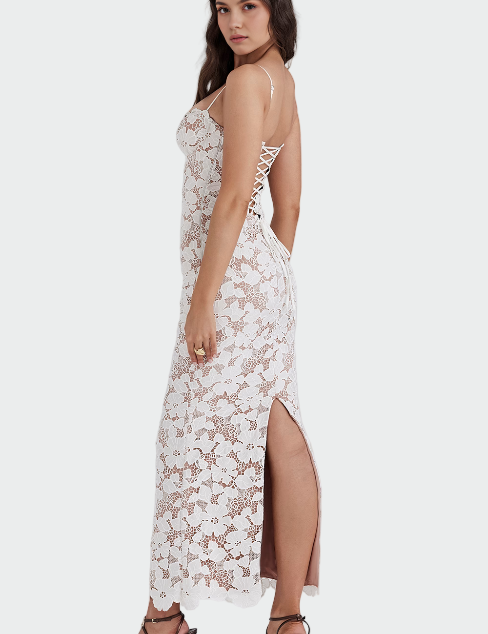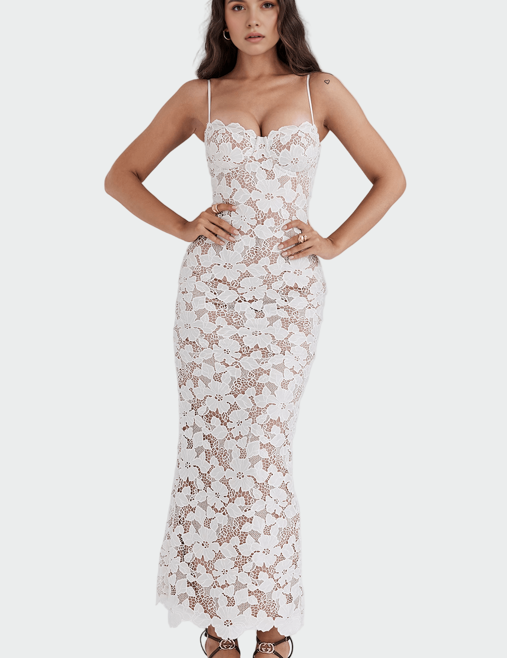 Elegantní Bílé Krajkové Maxi Šaty Jemným Florálním Vzorem