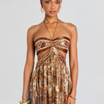 Šaty jsou ideální volbou pro večerní vycházky, koktejlové párty letní oslavy , které vyžadujíglam vzhled a výrazný styl. Kombinace zlaté, hnědé a terakotové palety vytváří teplý, bohatý vzhled, který svítí ve světle reflektorů a ještě podtrhuje vaši postavu.