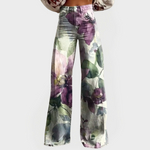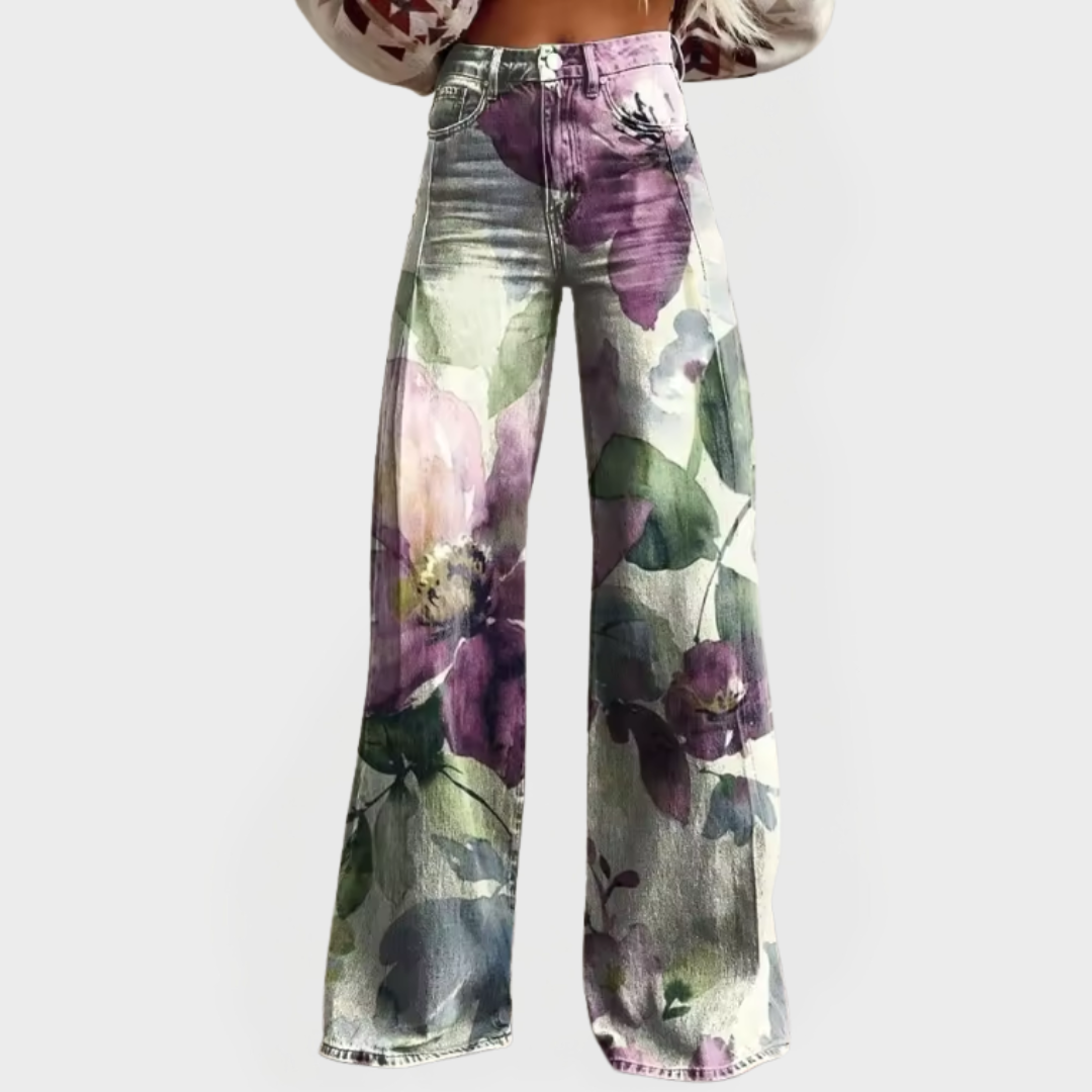 Kalhoty zvonového střihu s květinovým vzorem v sobě spojují romantickou eleganci s každodenním komfortem. Na denimovém materiálu jsou jemně namalované květiny v odstínech fialové a zelené, které dodávají vašemu šatníku svěží jarní nádech.