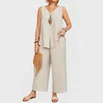 Představujeme lehký a sofistikovaný set kostýmu, který spojuje minimalistický vzhled s moderním charakterem. Top bez rukávů s decentním výstřihem vepředu a široké kalhoty vznikající letní outfit s nádechem luxusu — pohodlný pro každodenní nošení i stylový pro venkovní akce.