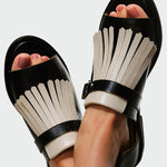 Λουκρέτσια – elegantní platformové sandály s třásněmi, které avantgardní vzhled spojují s pohodlným nošením pro každý den. Kombinace klasické černé barvy s bílými detaily vytváří výrazný kontrast a dodává botám švih a osobnost.