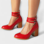 • Design: kulatá špička s trojitými pásky kolem kotníku a čtvercovým podpatkem