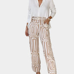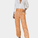 Přidejte do svého šatníku novou úroveň pohodlí a eleganci s naším geometickým kalhotovým setem, který obsahuje pás jako dárek. Jemný potisk ve tlumených volných tónech dodává styl bez zbytečného překombinování a díky střihu s vysokým pasem zůstává pohodlný po celý den.