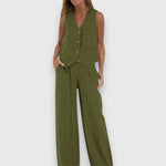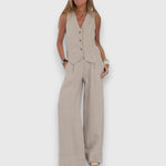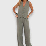 Set Nina spojuje letní lehkost s elegantní jednoduchostí – ideální pro horké dny a stylové outfity. Těsný top bez rukávů se spojuje s volnými kalhotami a vytváří moderní, lichotivou siluetu, která vyžaduje ženskost v pohodlí.