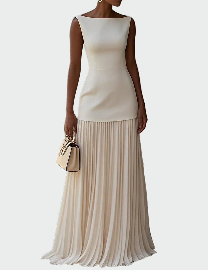 Krémové Plesové Maxi Šaty s Těsným Vrškem Plisovanou Sukní
