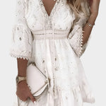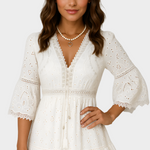 Objevte lehkou esenci boho stylu s našimi letními krátkými šaty s krajkou. Tento stylový mini kousek jemne vyšívanou krajkou, romantický V-dekolt a široké rukávy pro komfort po celý den.