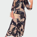 Šifónové midi šaty Trevina přinášejí noc plnou luxusu a elegance. Unikátní vzor ve tmavých odstínech s výraznými zlatými detaily dodává aristokratický nádech, ideální pro výjimečné příležitosti.