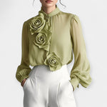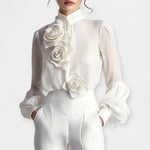 Elegantní bílá blůza s trojrozměrnými růžemi dodává šatníku nádech romantiky a luxusu. Vysoký límec a jemně průsvitný šifonový materiál vytvářejí vzdušnou a vytříbenou siluetu, která se hodí ke každé příležitosti.