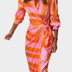 Midi šaty s pruhovaným vzorem představují definici současné elegance. Živé odstíny růžové a oranžové spolu s výrazným vzorem wrap vytvářejí okamžitě poutavý dojem a podtrhují vaši ženskost.