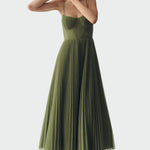 Elegantní a ženské šaty s tenkými ramínky a přiléhavým korzetovým výstřihem, který obepíná tělo a vyžaduje siluetu. Plisovaná midi sukně dodává šatům jemný pohyb a nadčasový šarm. Ideální volba pro stylový vzhled na svatby, gala večery a jiné formální příležitosti.