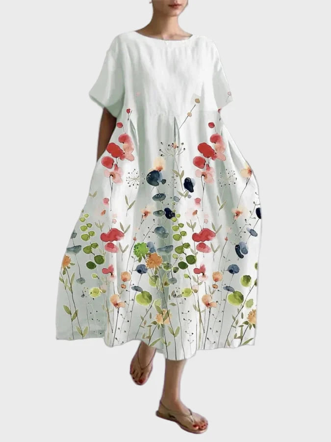 Šaty v romantickém střihu zajišťující pohodlný a ženský pohyb po celý den — ať už jdete na procházku, vyrazíte na výlet, nebo se chystáte na letní akci. Elegantní kombinace bílé základny a živých odstínů květin podtrhuje vaši svěžest a důvtipný styl.