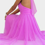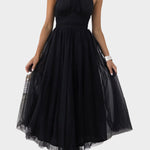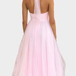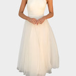 Vysoký límec s mašlí dodává šatům sofistikovaný a noblesní vzhled. Přiléhavý živůtek jemně kopíruje křivky a zvýrazňuje pas, zatímco objemná tylová sukně vytváří romantický a pohádkový efekt, který se bude pohybovat spolu s vámi.