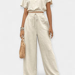 Objevte lehkost a styl s naším setem s volným střihem. Tento outfit vyniká pohodlím a svobodou pohybu, ideální pro horké letní dny. Krátký top s nafouknutými rukávy vytváří boho nádech a spolu s vysokým pasem kalhot se šňůrkou na stažení tvoří stylový look, který lichotí ramenům i postavě.